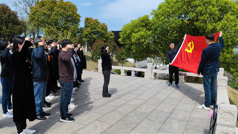 在新四軍太湖游擊隊(duì)紀(jì)念館的五人英雄石雕像前,新安黨支部的黨員們迎著春風(fēng),面對黨旗再次重溫入黨誓詞,擲地有聲鄭重宣誓。